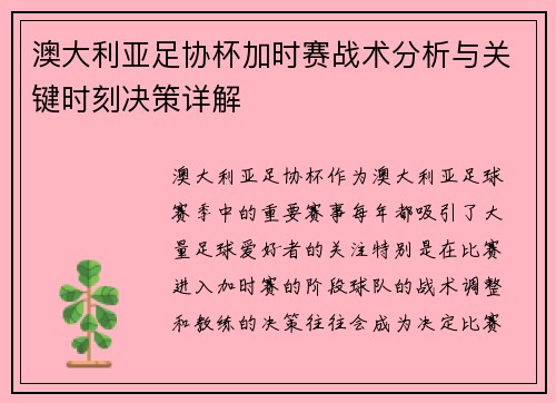 澳大利亚足协杯加时赛战术分析与关键时刻决策详解